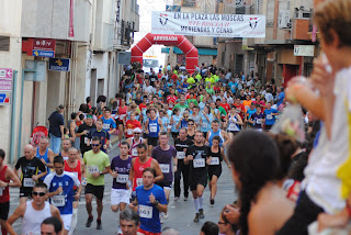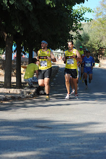 Mucha gente conocida en la salida: la saga de los Iglesias, Tere Plá a la que hacía mucho tiempo que no veía, el incansable Rafael Murcia, Jorge Larive a quien después de mucho tiempo conseguí conocer y que acabó tocado (a ver si no es nada, campeón), y, cómo no, Jorge, el amigo Sucesordeparra, con quien acabaría compartiendo gran parte de la carrera. Un breve calentamiento acompañado por un sofocante calor dio paso a la espera de los últimos cinco minutos antes de empezar la carrera. Como anécdota curiosa; después de tantas carreras a punto estuve de salir sin chip (bueno con el mismo en el bolsillo) y gracias a que me di cuenta de casualidad y pude ponérmelo a punto y hora. Bueno, salida con la idea de hacer la carrera con Jorge a ritmos más o menos cómodos pero con la certeza, ratificada en el calentamiento, de que el calentón del sábado por Teruel acabaría por dejarse notar. El caso es que en el momento de la salida, y una vez conseguido el espacio vital para correr, una vez más el ritmo de inicio fue superior al previsto. De hecho hasta el repecho del inicio (más o menos a los quinientos metros) el ritmo era de 4.30 más o menos. Este primer repecho ya empezó a dejar claro que las piernas no iban frescas; se trata de un costerón cortito pero "intenso" que te deja preparado para sufrirlo el resto de carrera. Después del mismo un breve callejeo por el pueblo, pasando por el Ayuntamiento, para volver a pasar por la línea de salida poco antes del dos. En ese momento cambiamos el rumbo y nos dirigimos hacia la autopista (ver primera foto) previo paso inferior de la vía del tren. Ya entonces habíamos consumido tres kilómetros a una media de 4.41 el kilómetro y personalmente no iba nada cómodo. Me temo que más que físicamente, que tampoco, era una cuestión de cabeza. Creo que se superará pronto pero vuelve a costarme mantener el coco convencido de mantener el ritmo que llevo y eso, inevitablemente, me lleva a acabar claudicando, bajar el ritmo e, incluso, parar cuando al final sé que soy capaz de mantenerlo.