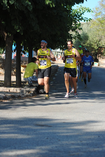 Pero bueno, ya digo que poco a poco seguro que esta circunstancia se superará. Superada la vía del tren tocaba transitar de manera paralela a la autopista en un tramo en el que si vas con fuerzas puedes volar antes de cruzar el puente elevado sobre la misma, que también se atraganta, para a continuación seguir entre huertos y volver por el otro lado de la autopista para, nuevamente entre huertos volver para superar el mismo puente en dirección contraria. Todo este tramo lo hago de más a menos porque las piernas "duelen" y la cabeza no está dispuesta a imponerse en esta batalla. Así, el ritmo medio va sumando segundos progresivamente de manera que el segundo tres mil sale ligeramente por debajo de cinco el kilómetro. Alcanzado el seis "libero" a Jorge de mi compañía y le digo que siga adelante que yo voy a bajar el ritmo, algo que hago hasta incluso caminar brevemente a pesar de que no iba nada asfixiado. Pero bien, enseguida reemprendo la marcha e incluso recibo los ánimos de un monstruo de este mundo del trail, Vicente Calvo, que iba por allí con la cabra. Superado el segundo paso del puente de la autopista me digo que hay que echar el resto y poco después la visión del kilómetro siete me hace superar las dudas y lanzarme hasta el final intentando no ser superado por la legión de corredores que llevo detrás, algo que consigo, llegando a meta, disfrutando pese a todo del momento, en algo más de treinta y siete y por debajo de cinco el kilómetro.
